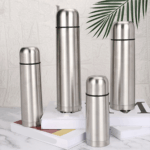 Made of durable stainless steel, these water bottles have double wall insulation for long-lasting temperature control. They feature a screw on, spill-resistant lid and a convenient pop-up lid for easy pouring.