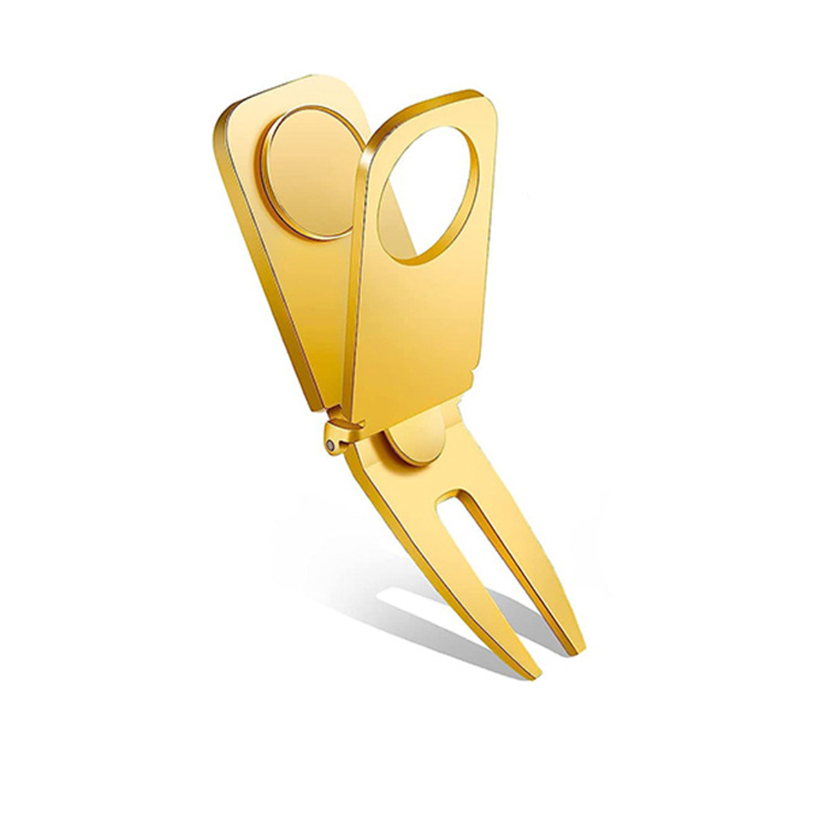 The Golf Tool is a lightweight and portable divot tool made of zinc alloy. The foldable design makes it convenient to use as a club or cigar rest stand. Features strong magnet to be attached to metal surface as needed. A golf ball marker can be easily removed to use alone. Built to last- heavy duty construction with a high polished beautiful finish. It's made with a strong magnet that will securely attach to your golf cart or any steel surface.