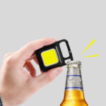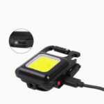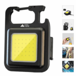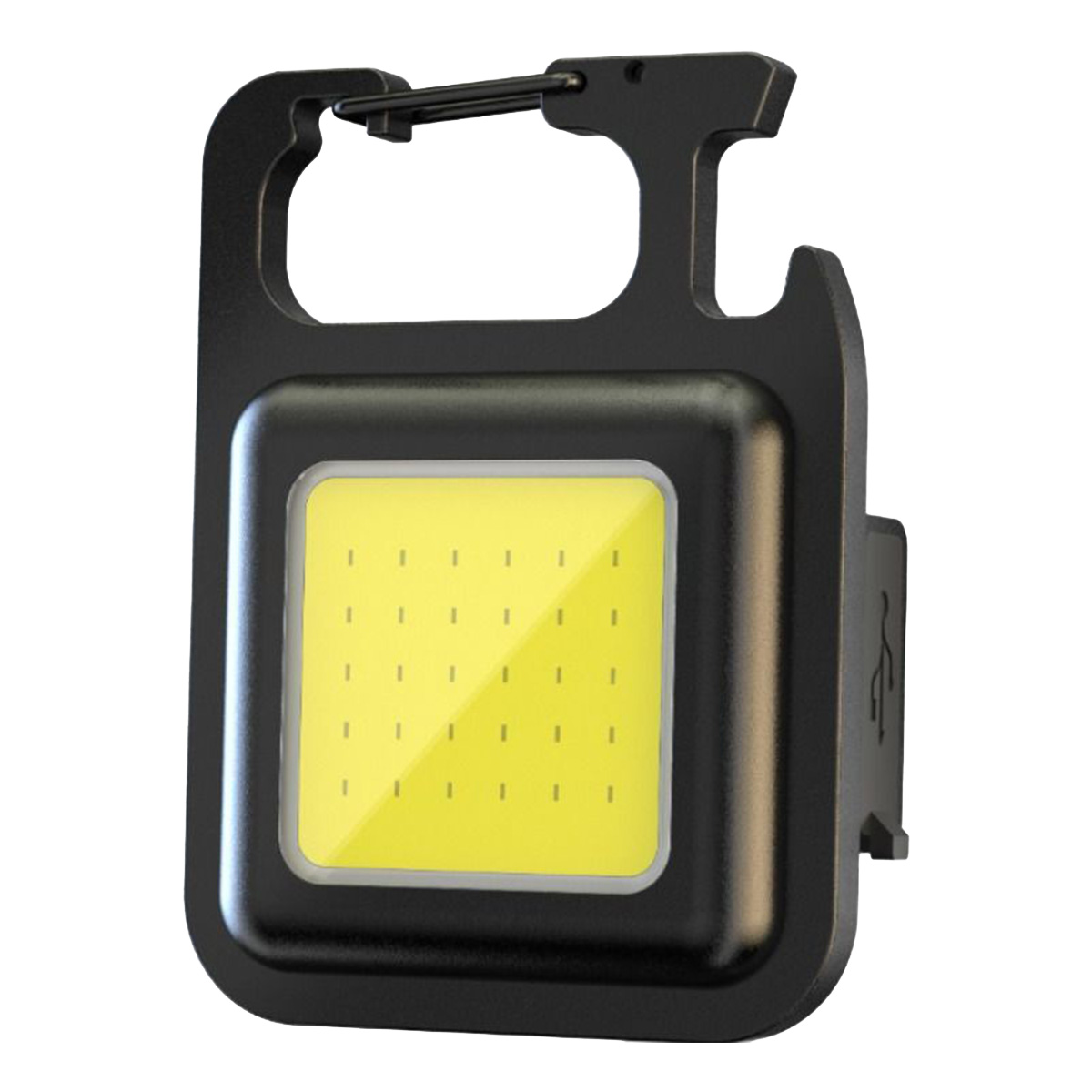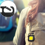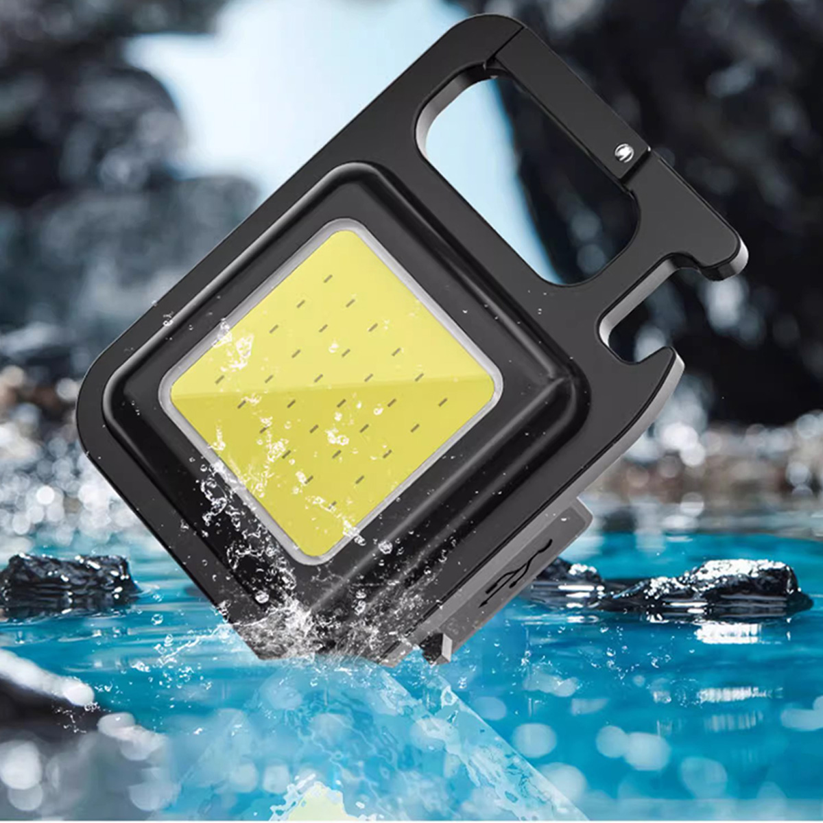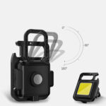The compact flashlight has 3 light modes: high, low, and strobe. It is portable with a carabiner for easy attachment to key rings or bags. It is water and impact resistant, and has a strong magnet base and rotatable handle for hands-free use. The magnet design allows attachment to any metal, and the 180 foldable handle allows for different angles or hanging.