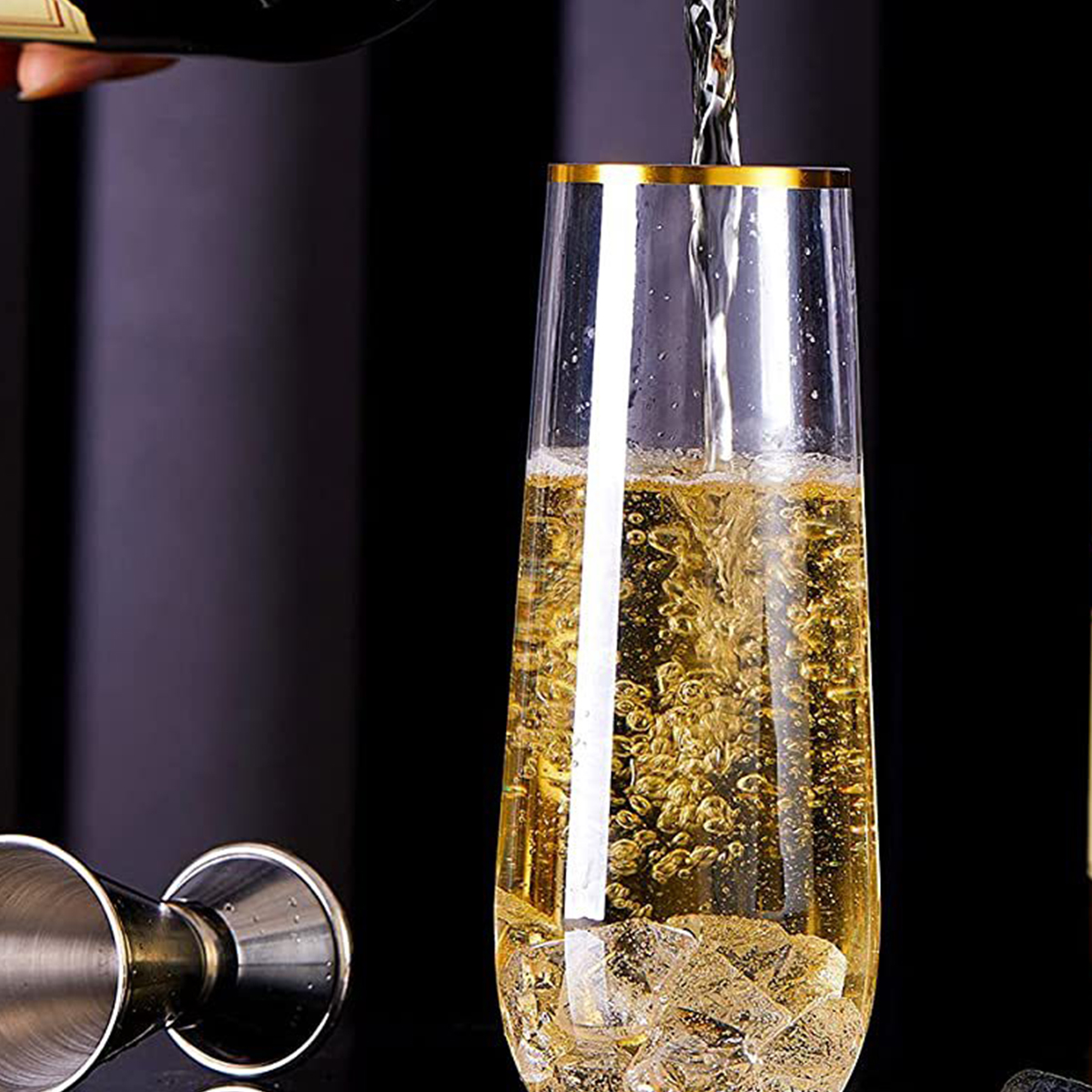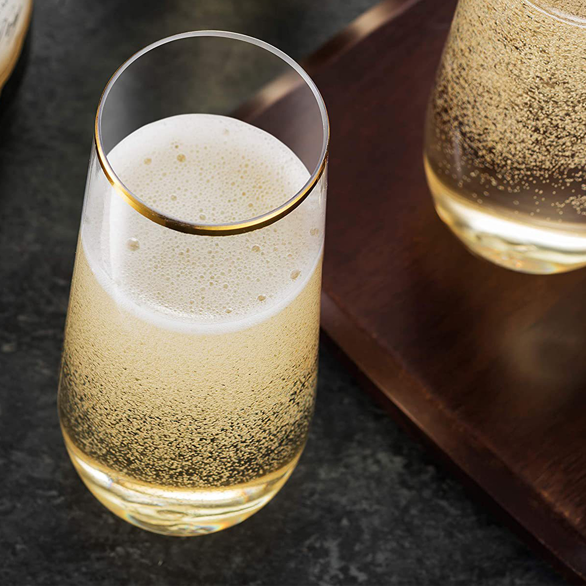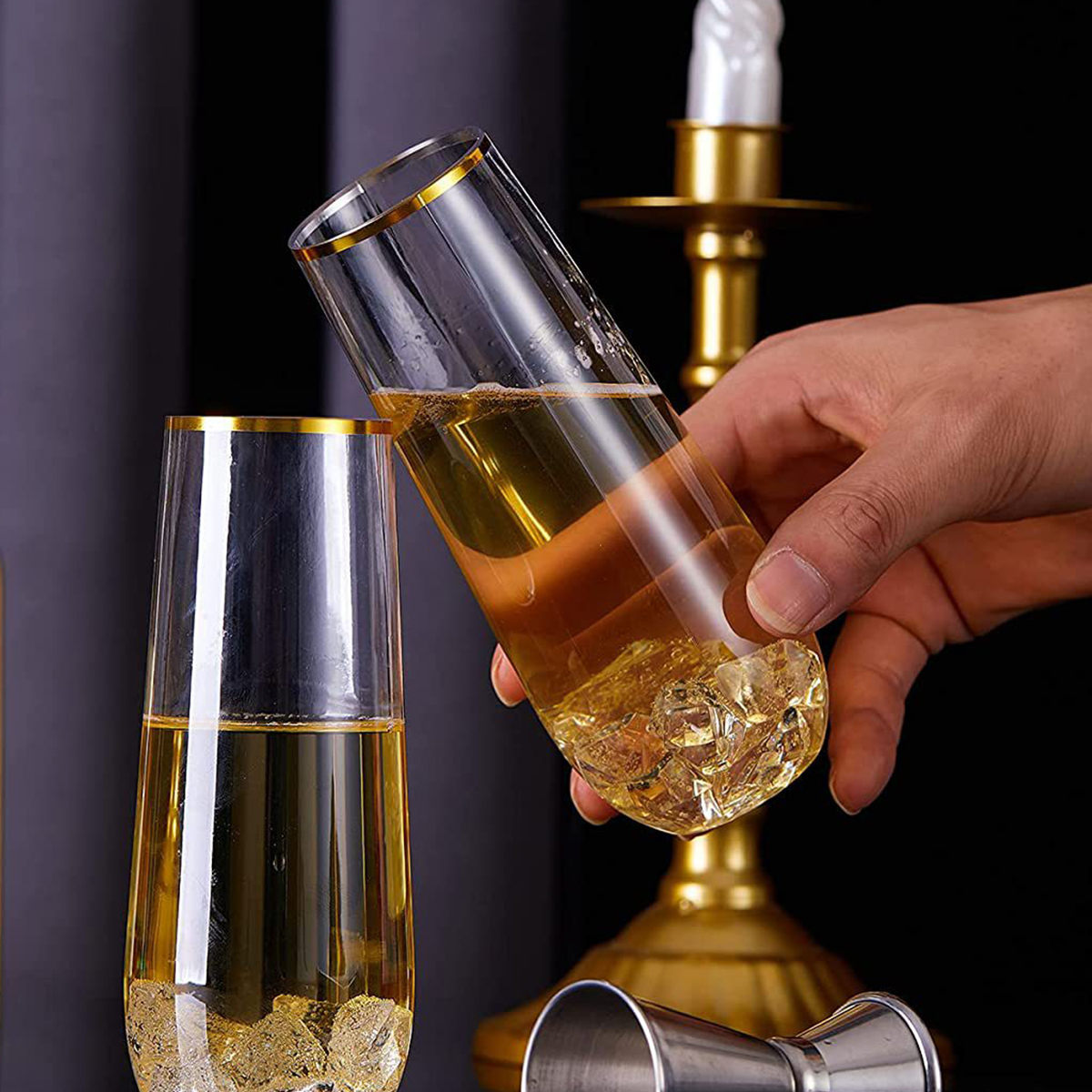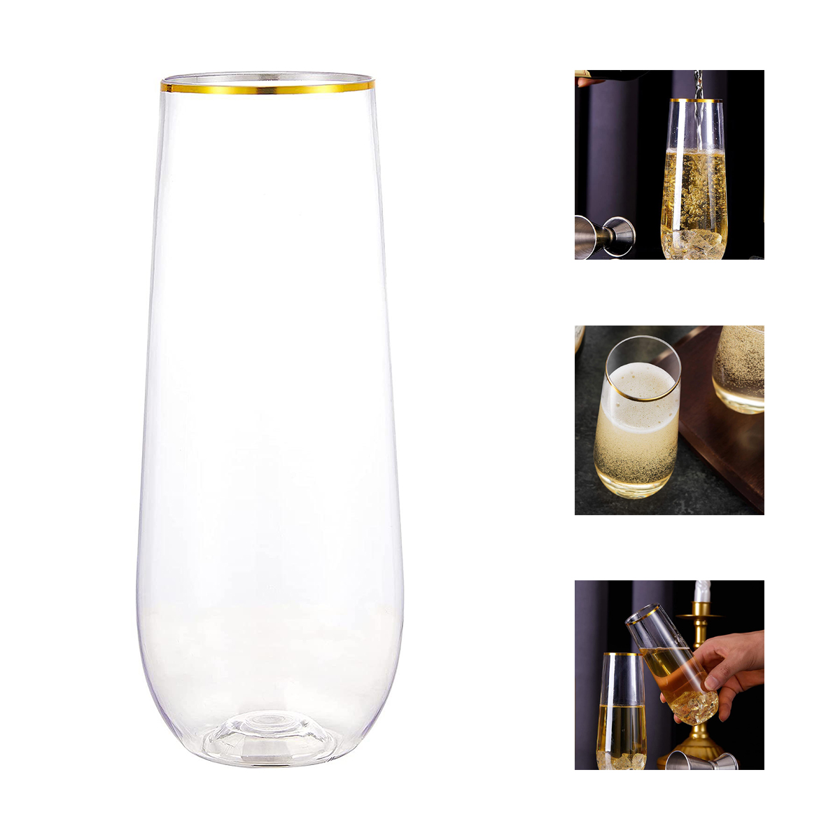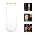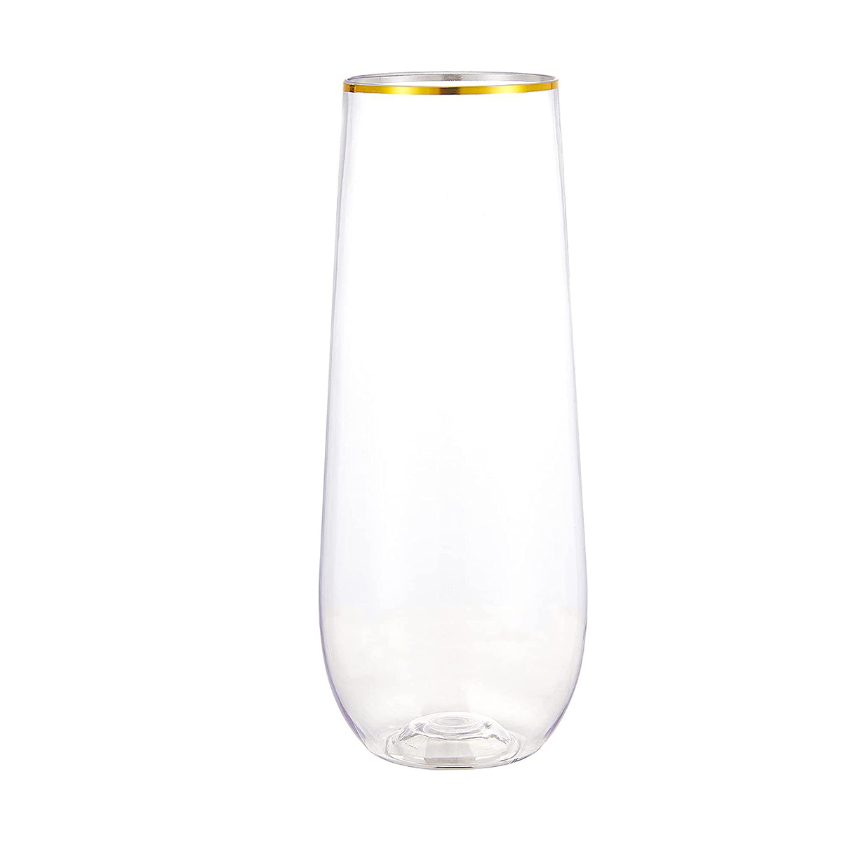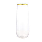 The stemless plastic champagne flutes are made of shatterproof, recyclable, BPA-Free materials, so you can use these gold plastic toasting glasses with confidence. Featuring a beautifully shaped design and a delicate gold rim, these plastic champagne glasses from tableware will add some sparkle to any event. Whether it's champagne, whiskey, chardonnay, or non-alcoholic beverages, our plastic gold champagne flutes are up to the task.
