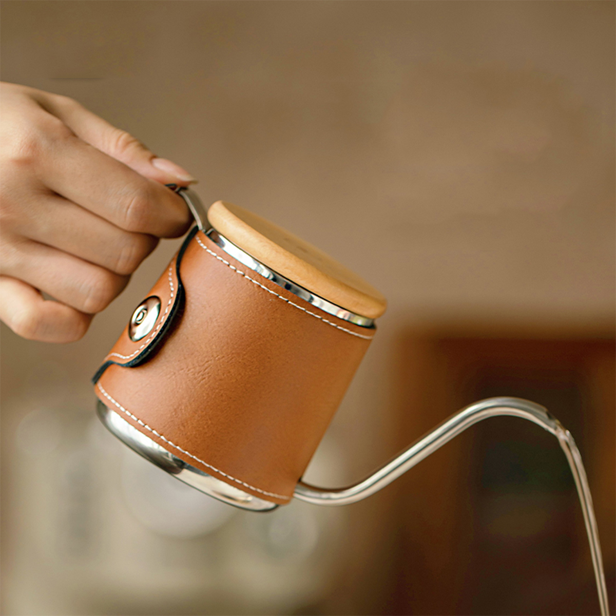 The handle is covered with PU leather, heat-resistant and scald-proof. Wooden lid handle for easy lid removal. Stainless steel material, tough and durable, easy to clean. Leather buckle for easy removal. The lid is tilted so that steam will not hit your hands. The stainless steel body is not only suitable for home or indoor use, but also easy to carry and you can enjoy coffee while camping outdoors. It is the best gift for relatives and friends.