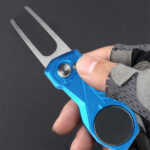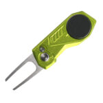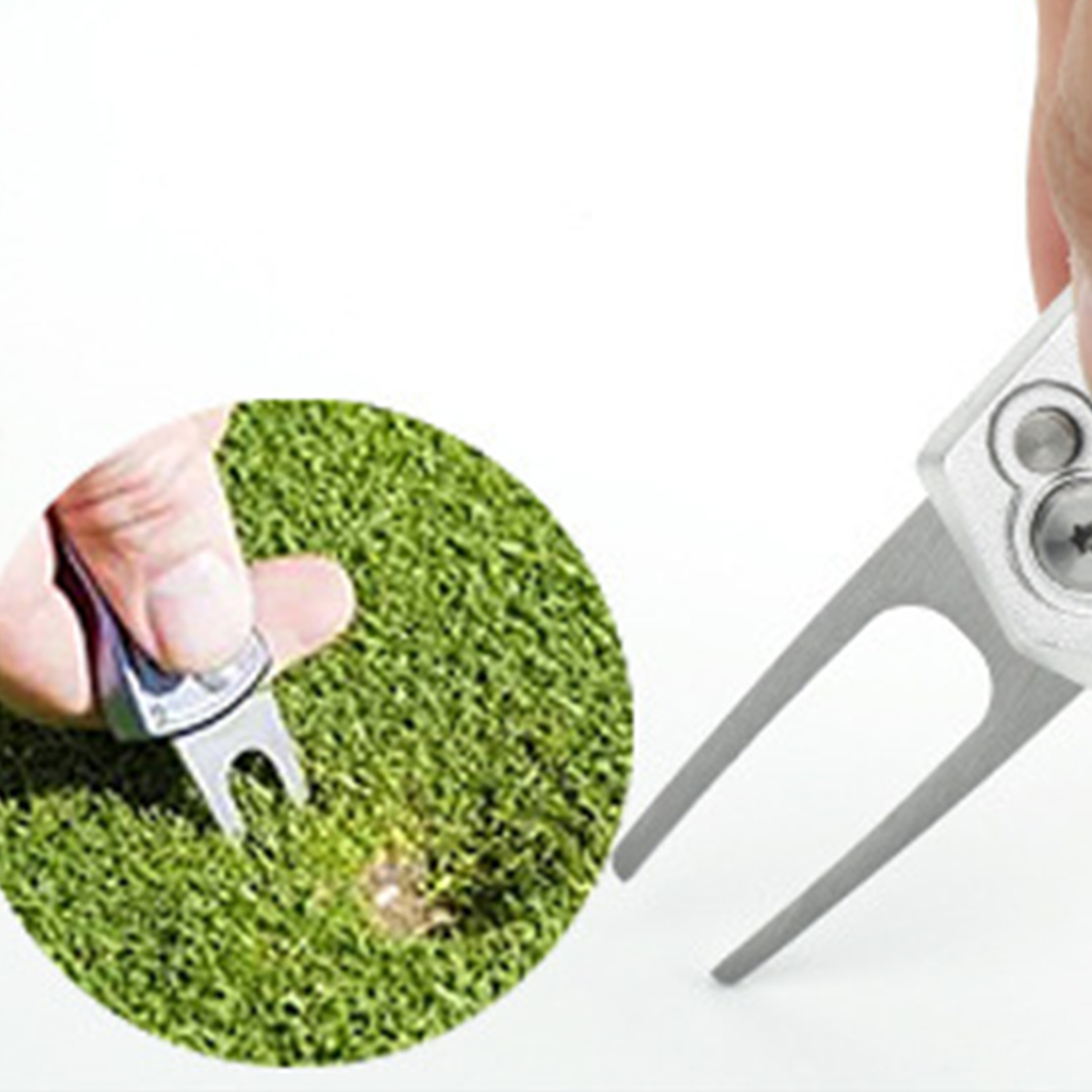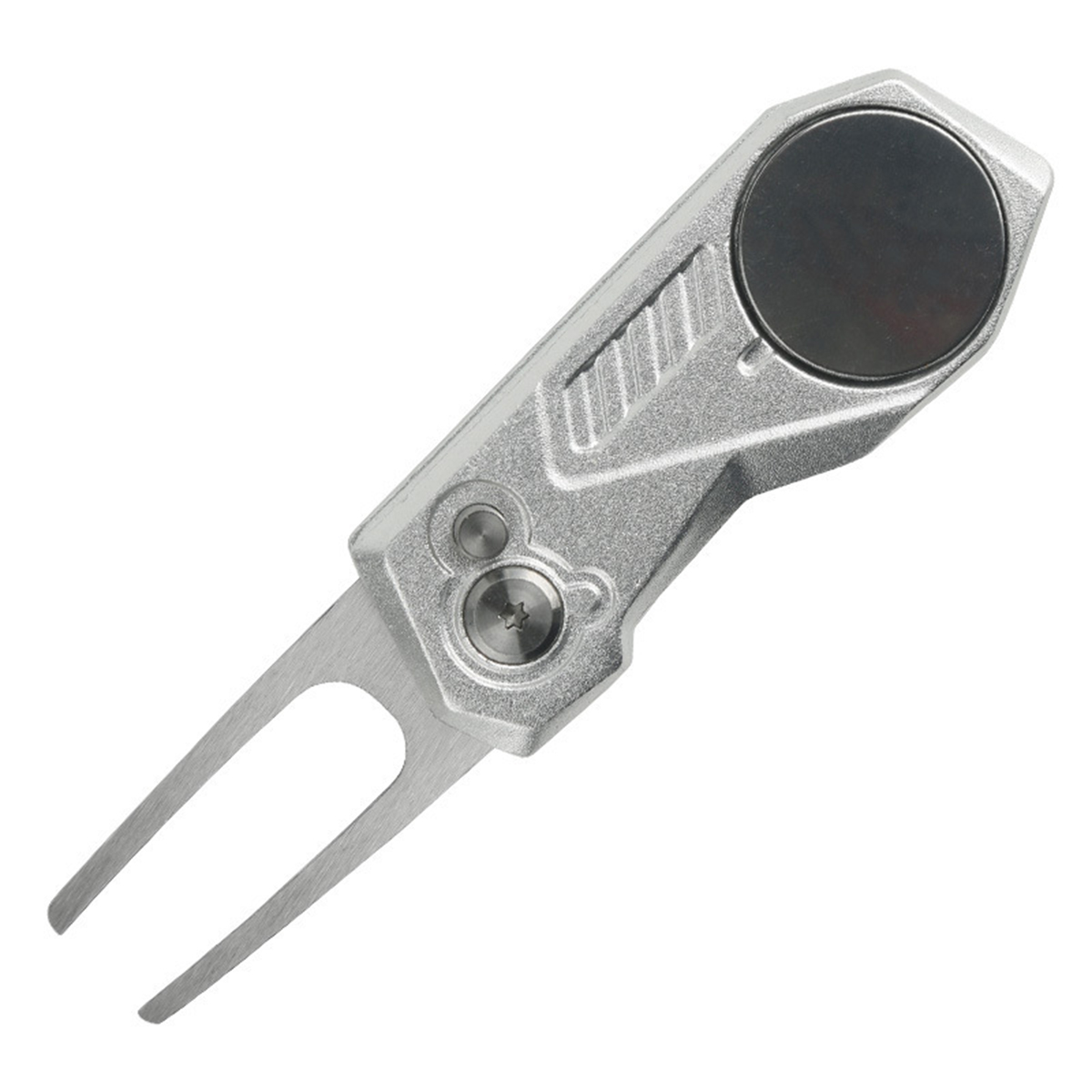 Leave the golf course looking as pristine after your round as when you arrived with this divot fixer tool and ball marker. Made of stainless steel, this device has switchblade action that releases a two prong tool repair divots and loose earth. The detachable magnetic marker helps keep track of your ball on the green. Makes a great gift from a favorite golf course, country club or pro shop.