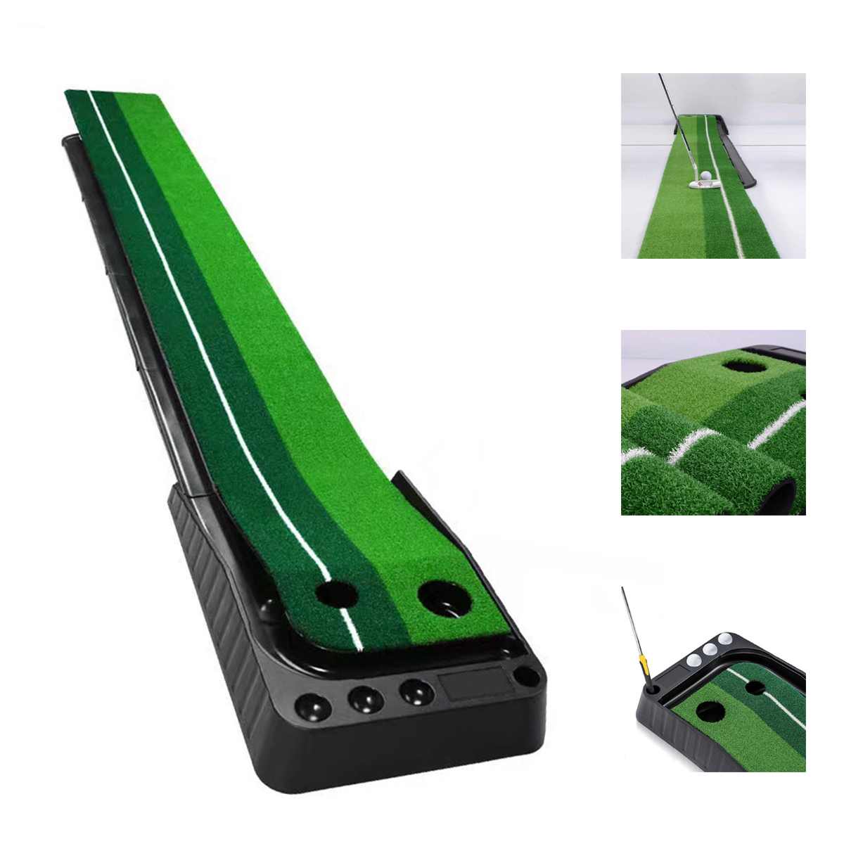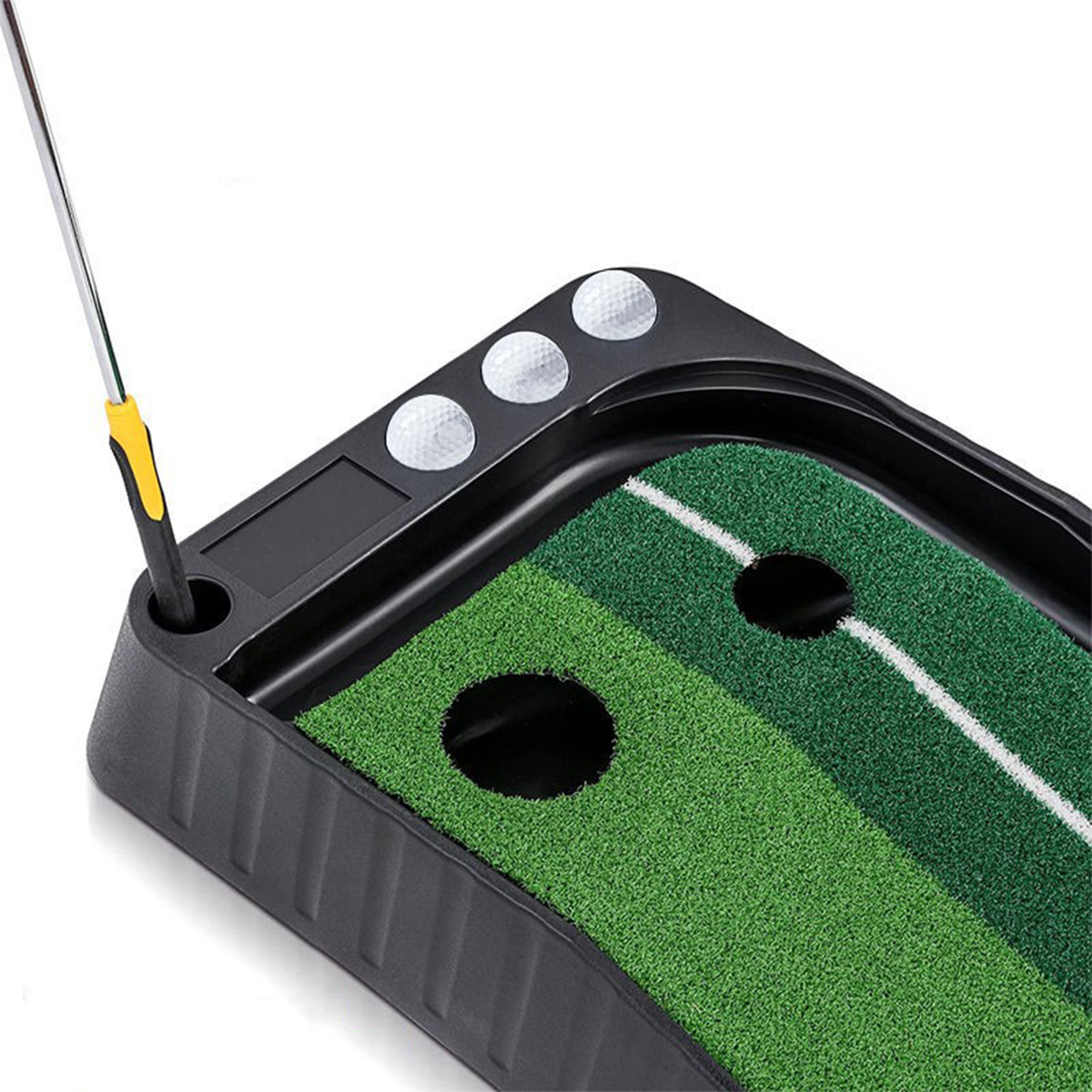 Work on your golf game in your down time -- or any time -- with this indoor practice putting green. This set is made of real feeling and acting artificial turf with an expandable design that offers multiple options to practice putting, short and long shots too at home or in the office. The smart ball return system means you can spend time practicing. Sets up in seconds and stores away neatly. Includes three golf balls.