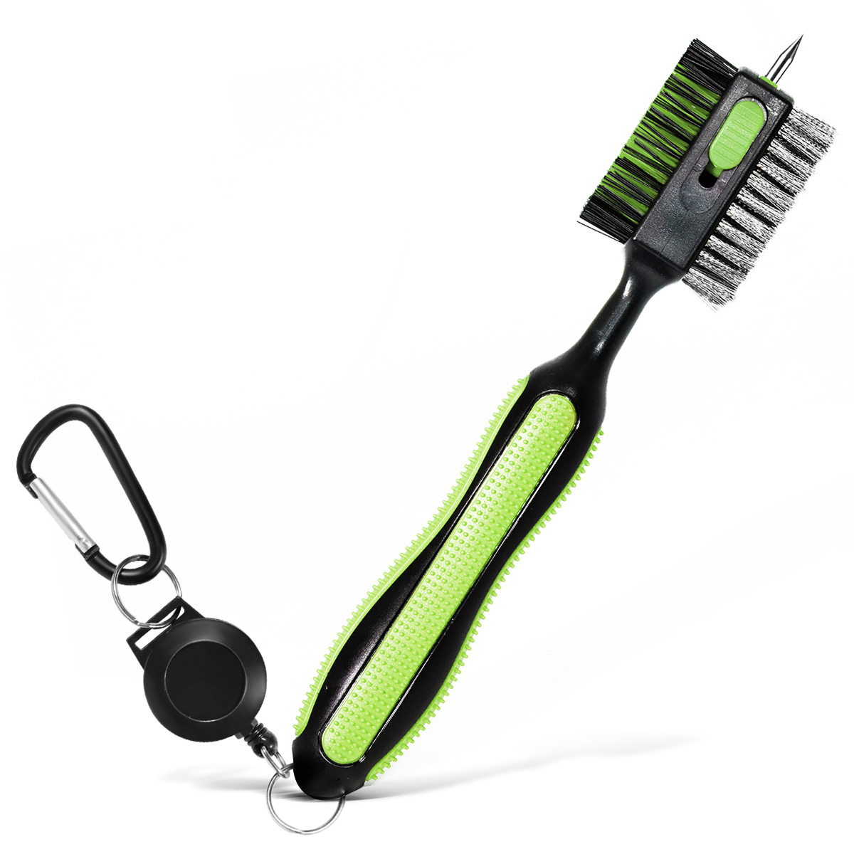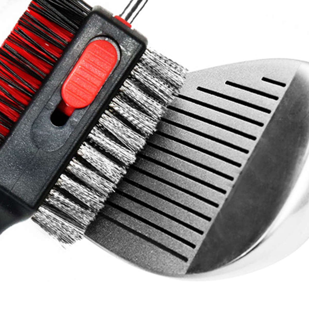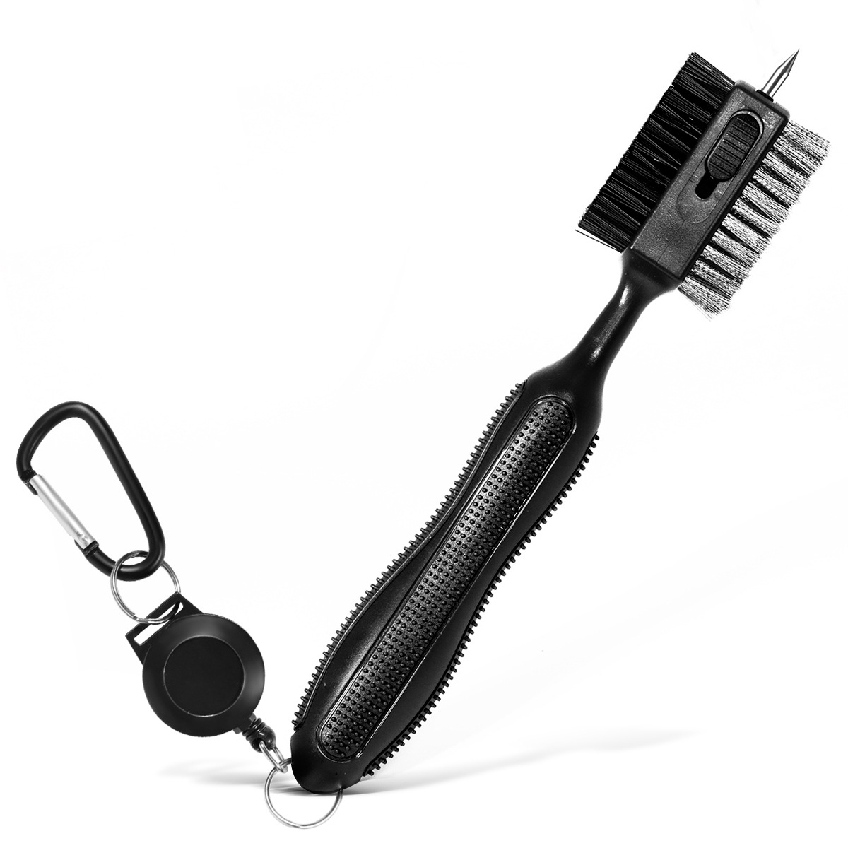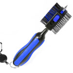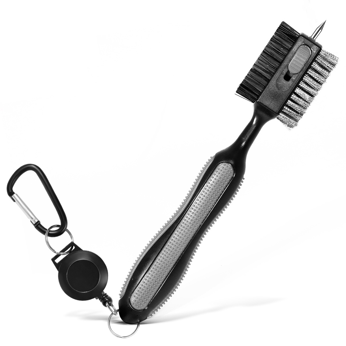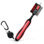 3 in 1 brush made with wire bristles, the other sides made with nylon bristles and a spikes on the top. It is the perfect combination to clean all your golf. The rubber grip is designed for a comfortable, non-slip feel. The brush can hang on your golf club, with the magnetic button you can remove it and put it on the golf brush in the easiest way. Retractable golf brush can clean individual grooves, push them forward to relieve stress when in use, hide them when not in use.
