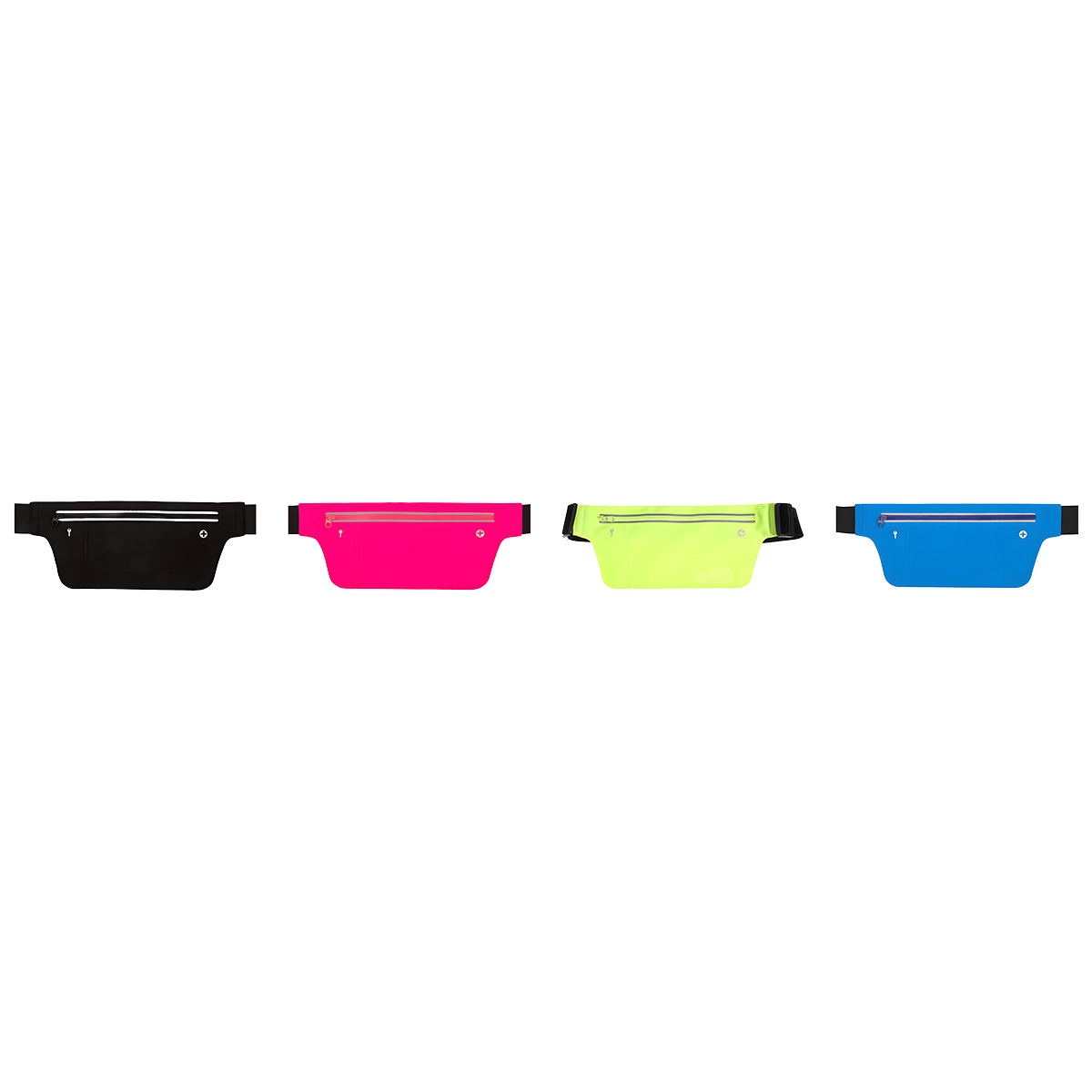 This fanny pack is made of quick-drying, stretchable neoprene/lycra fabric. It has a fully adjustable elastic strap, fitting waists. It securely holds smartphones, passport, keys, credit cards, money, and energy gels.